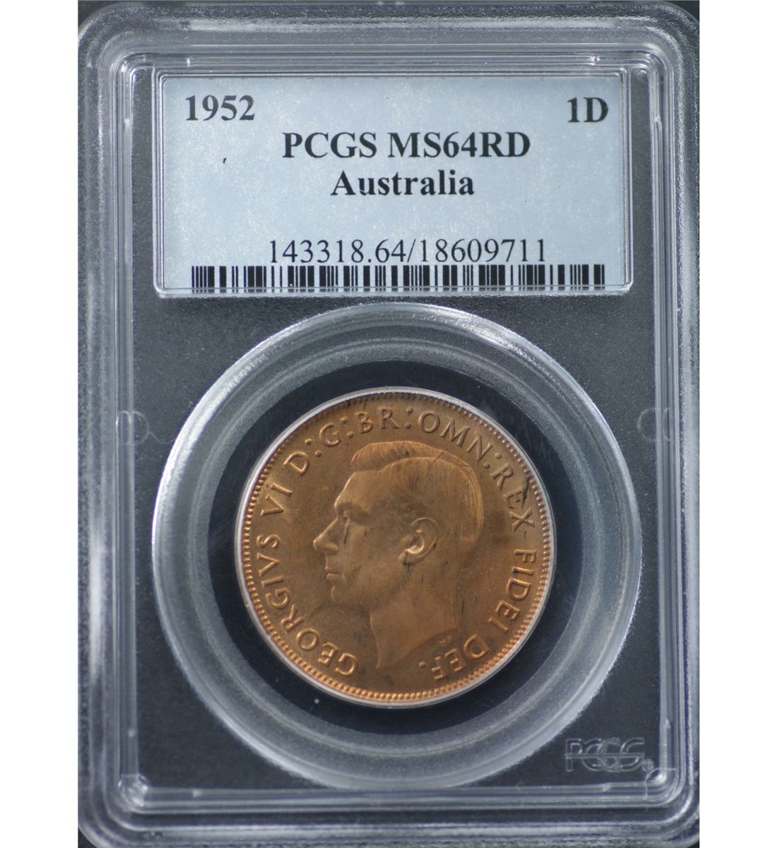 Australia Penny 1952 M NGC MS 63 BN UNC Bronze King George VI, Kangaroo : $85.00: 6d 4h left: 1952 M Australian Penny PCGS Grade MS63 RB slabbed: $134.00: 7d 23h left: Australia 1952 (m) One Penny 1d George VI - PCGS MS62BN (46754620) $65.00: 11d 1h left: Australia 1952 (m) One Penny 1d George VI - PCGS MS64RB (46754625) $125.00: 11d 1h left
