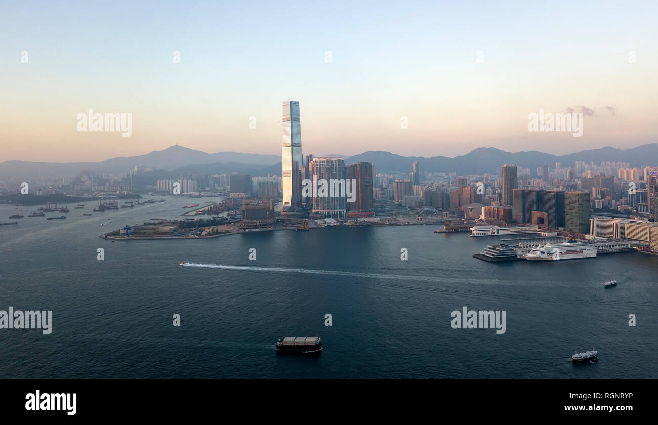 Aerial of the International Commerce Centre, ICC, and Victoria Harbor, Hong Kong, China Stock
