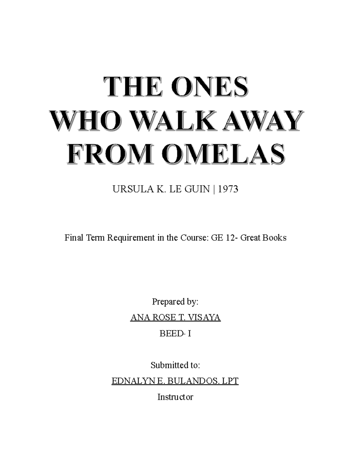 THE ONES WHO WALK AWAY FROM Omelas URSULA K. LE GUIN 1973 Final Term Requirement in the