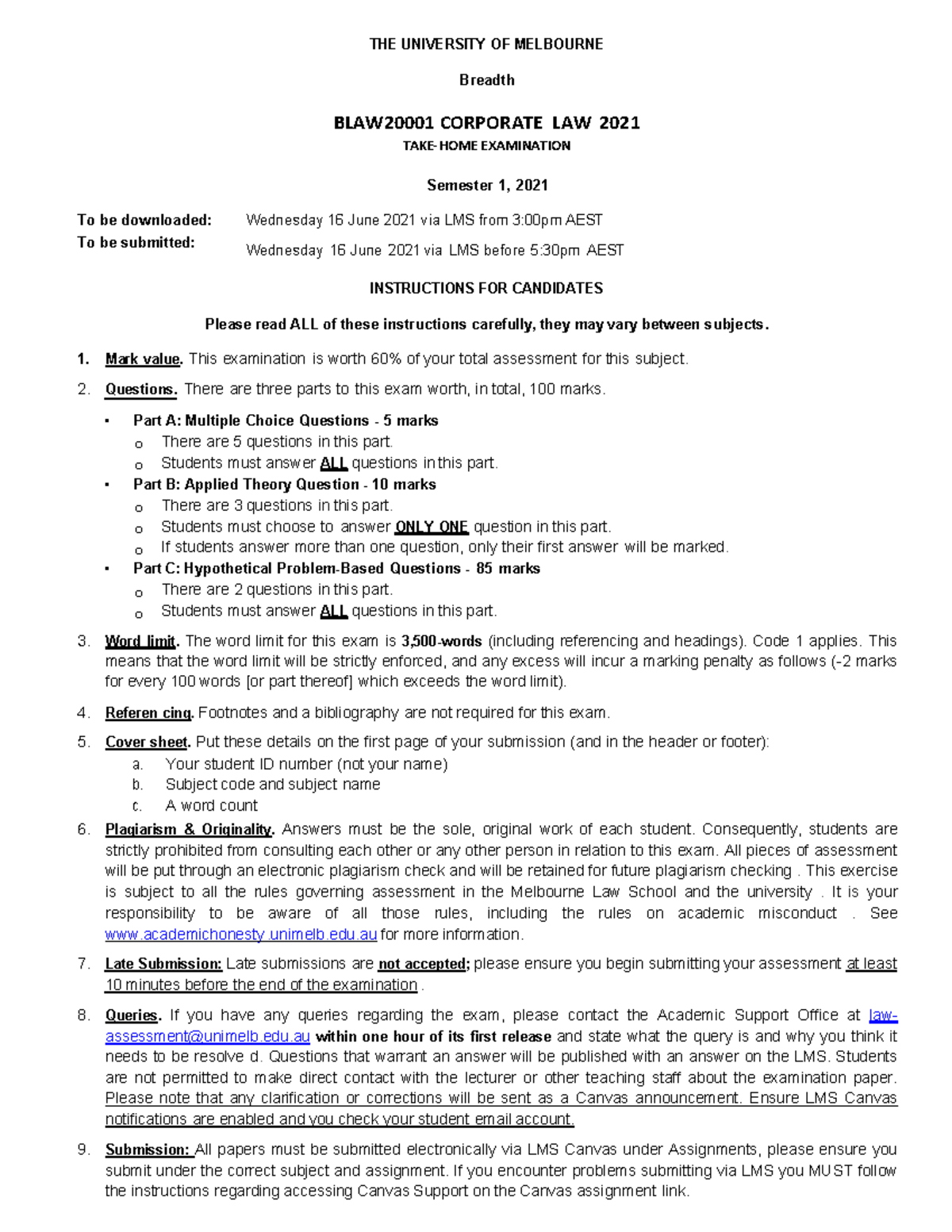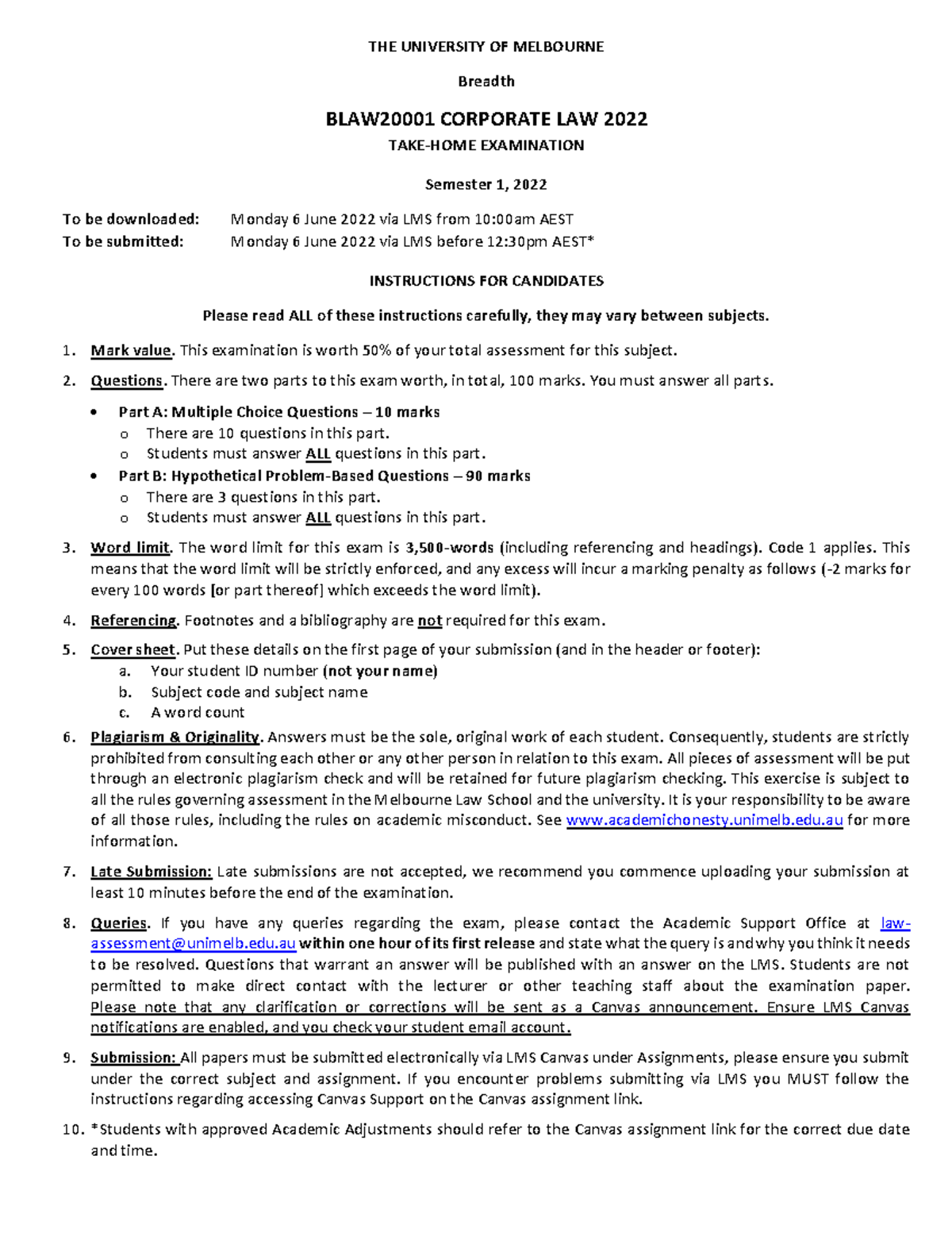 BLAW2000 1 Corporate Law 2022 Primary Exam Final THE UNIVERSITY OF MELBOURNE Breadth