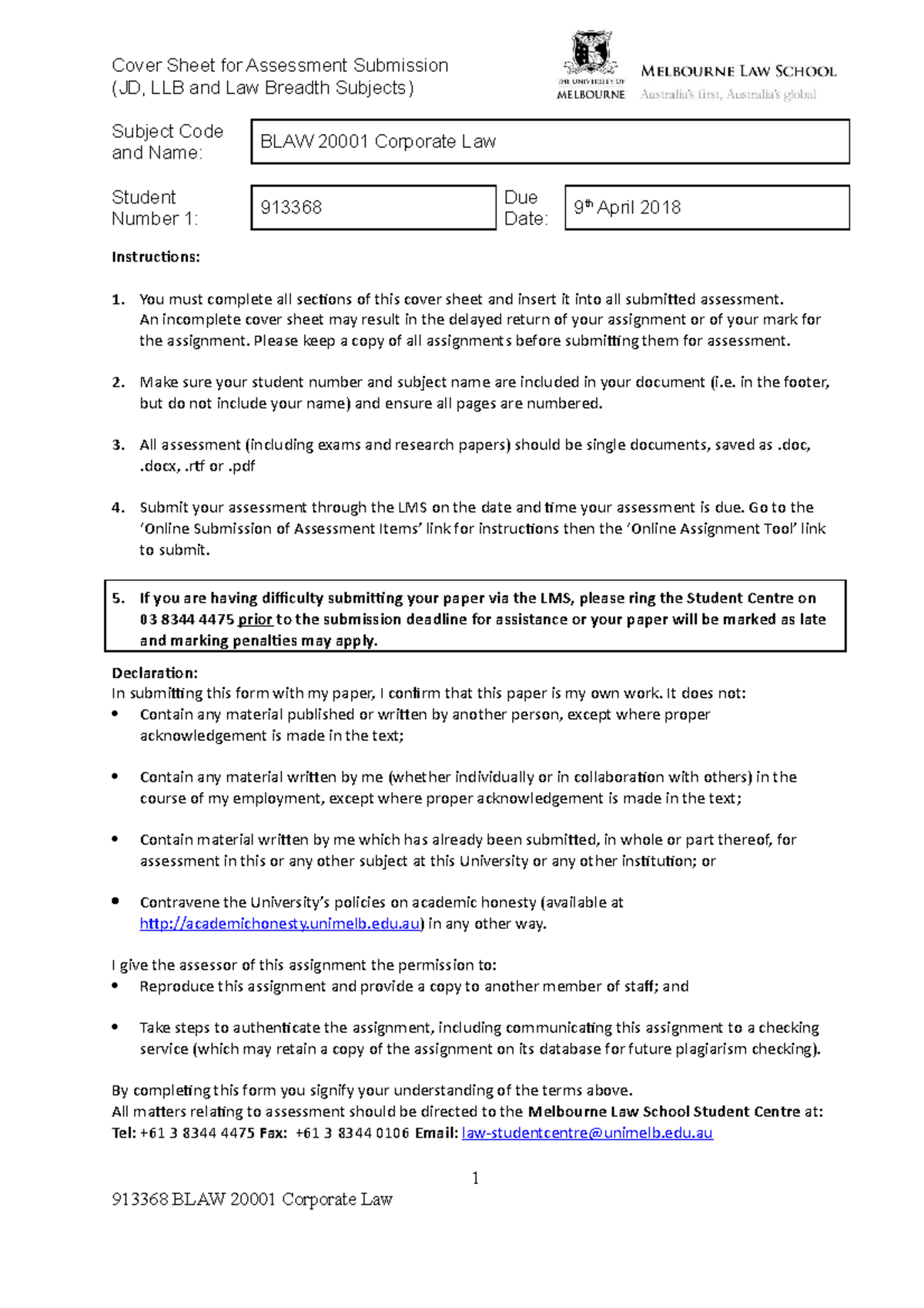 BLAW 2000 1 Assignment Cover Sheet for Assessment Submission (JD, LLB and Law Breadth Subjects